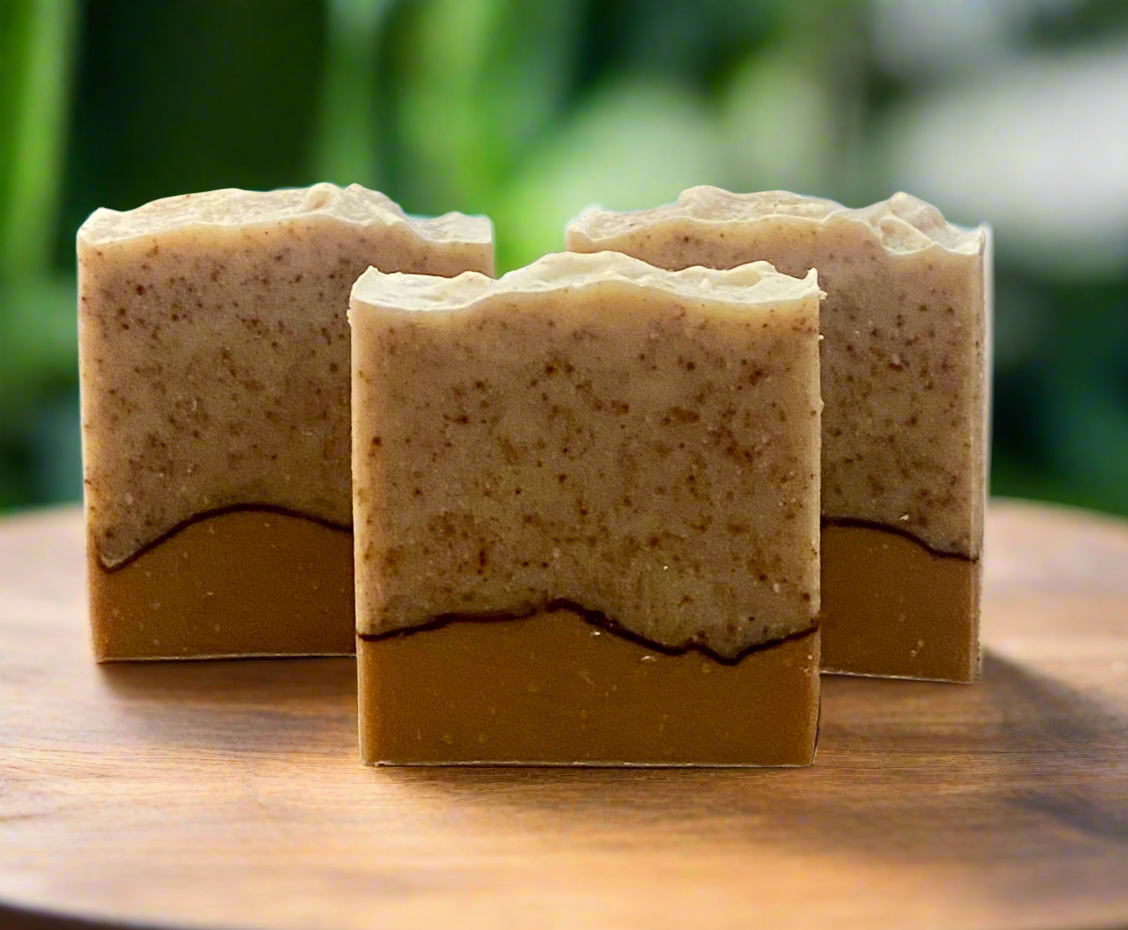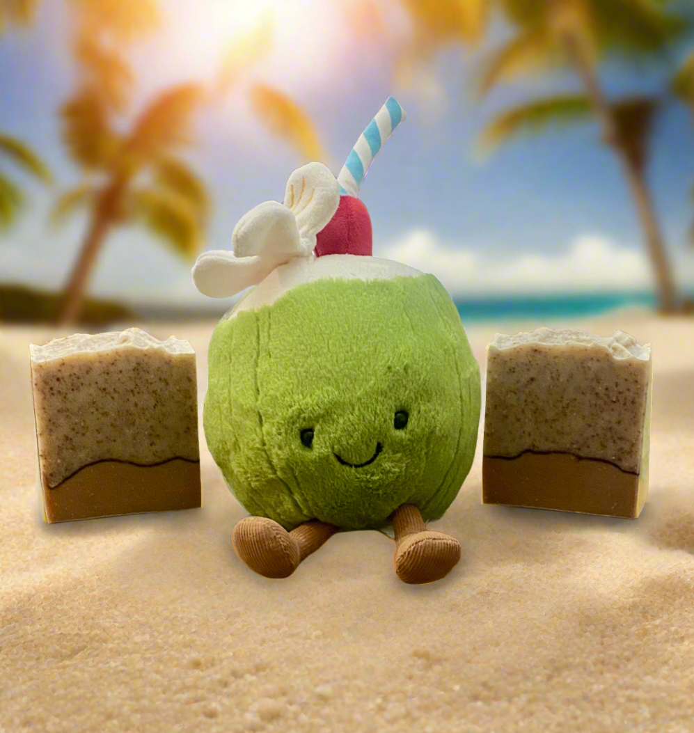 Take a stroll through the coconut grove while gentle palm fronds blow in the soft breeze. This soap combines all the best elements of a tropical summer day…crunchy coconut, sweet nectar, and a splash of tart lime are rounded out by notes of sun baked driftwood and green palm. A layer of organic cocoa, creamy coconut milk and finely ground walnut shells add the perfect final touch.