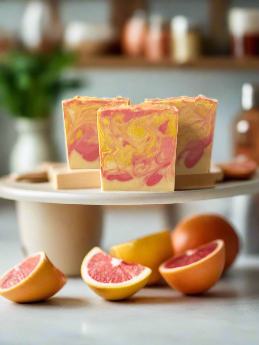 Juicy, ripe pineapple and tart pink grapefruit meet in this cocktail inspired soap bar! It’s a wonderful citrusy bright blend with swirly colors to match.